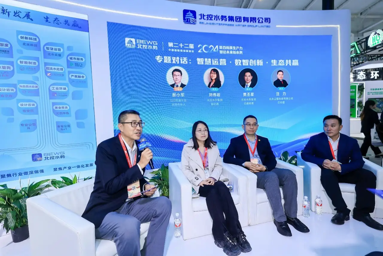 4月10日下午,在北控水務集團展臺舉辦“智慧運營·數智創新·生態共贏”專題對話,活動由E20高級合伙人郝小軍主持,北控水務集團副總裁劉偉巖、總裁助理賈丕星、北水云服總經理汪力作為嘉賓參加對話。對話討論了北控水務集團運營管理升級的策略、集團數字化轉型路徑、水務行業新質生產力等內容,并重點就北水云服科技公司的定位、使命以及愿景做了分享。
