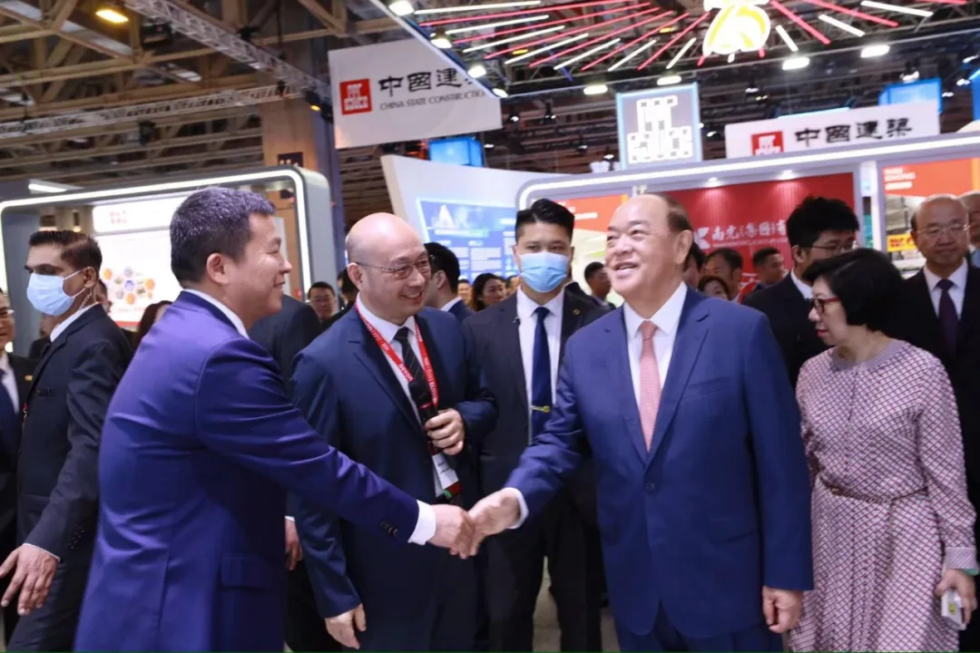 5月23日,澳門特別行政區行政長官賀一誠到北控水務集團展位參觀指導,集團副總裁冒建華、總裁助理黎定高熱情接待。