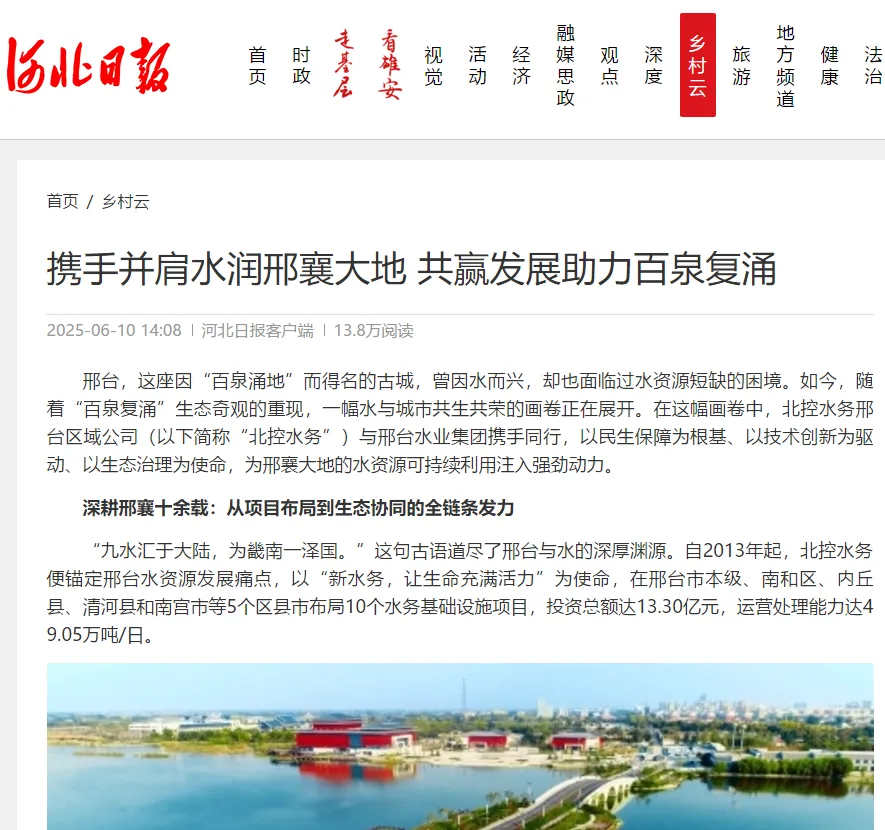近日,大慶晚報報道北控水務集團踐行“兩山”理念,助力大慶市推進生態轉型,通過污水處理、濕地保護、智慧水務等措施,實現從“油城”到“綠都”的升級,打造生態文明典范。